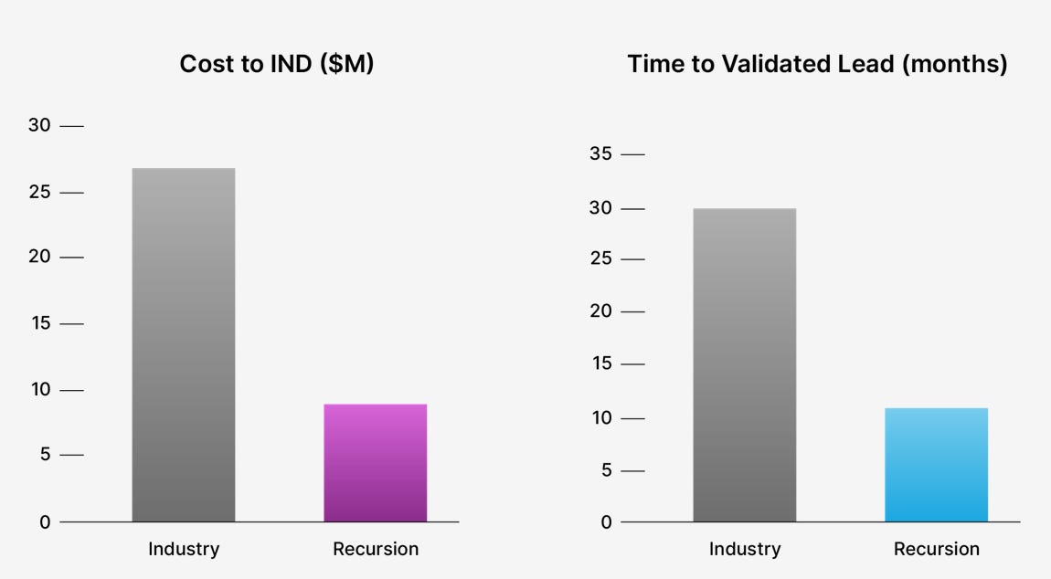 Recursion Pharmaceuticals, an AI-driven drug discovery company founded in 2013, exemplifies this approach. The company has formed partnerships with industry leaders like Roche, Sanofi, and Bayer. Recursion claims significant reductions in both “cost to IND” and “time to validated lead,” analogous to the hit-to-lead and lead optimization phases in Paul’s model. These steps together take a large number of molecules that bind or affect the intended biological target and arrive at a few optimized candidates.