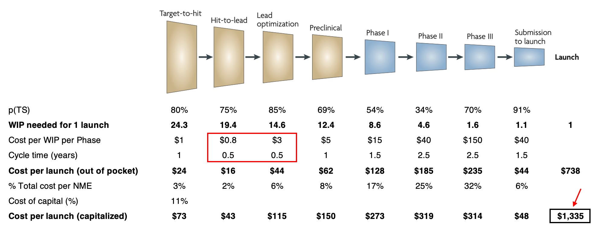 The new capitalized cost of $1.3B represents a 25% drop. Most of this is due to lead optimization being a relatively expensive process ($10M without AI) that you need to do with a lot of candidates (14.6). Lowering the cycle time also “pulls forward” the subsequent phases on the timeline, reducing the impact of time value of money.