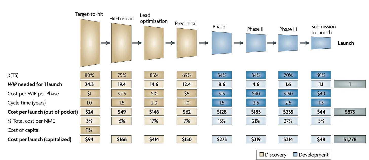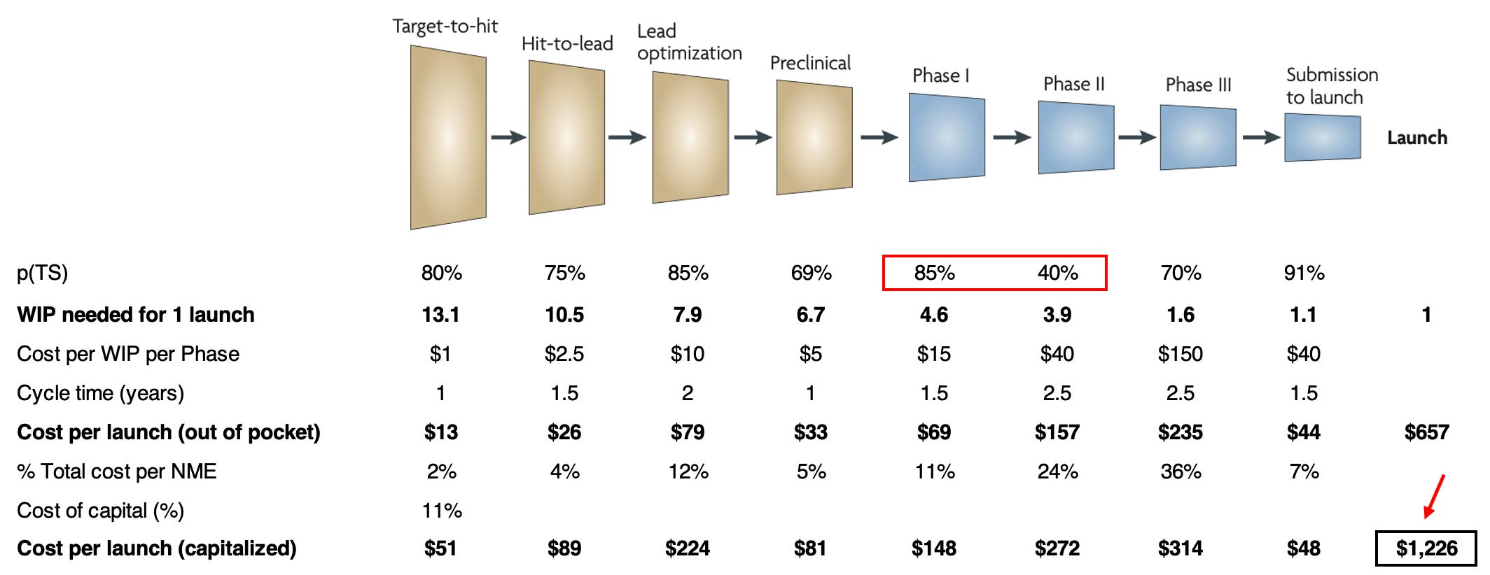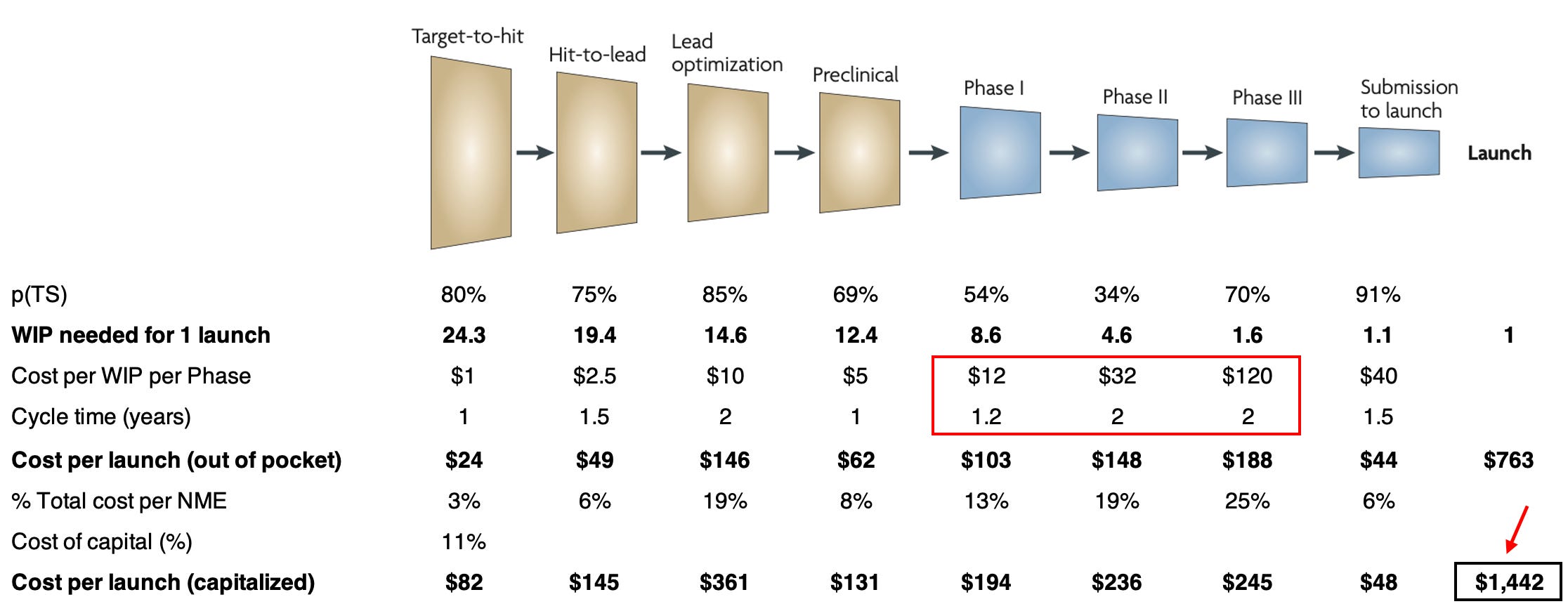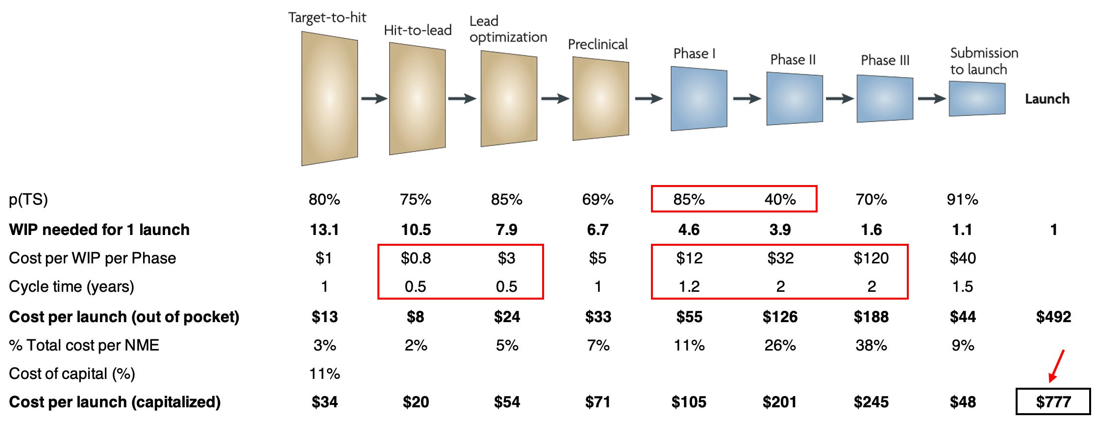 Paul’s drug process model, published in 2010, estimated the average capitalized cost of a drug at $1.78B. Today, it may exceed $6B. While the absolute numbers are staggering, what matters most is the percentage change that AI can deliver. We’ll base all our estimates on the assumptions of 2010. Again, for an explanation of the model, refer to part one.